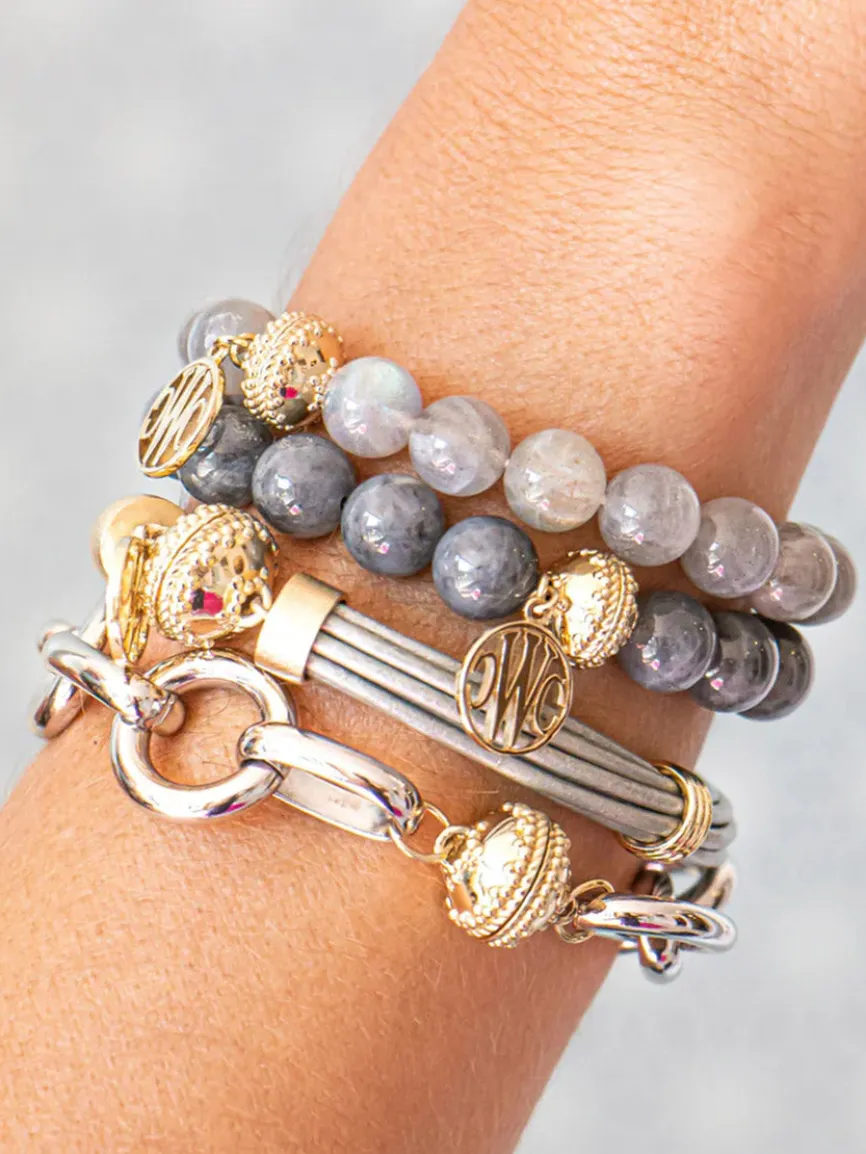 Rhodium plated smooth, alternating links. Hand-crafted. Plated 14K yellow gold Signature ClaraClasp™. 7.5″ length.