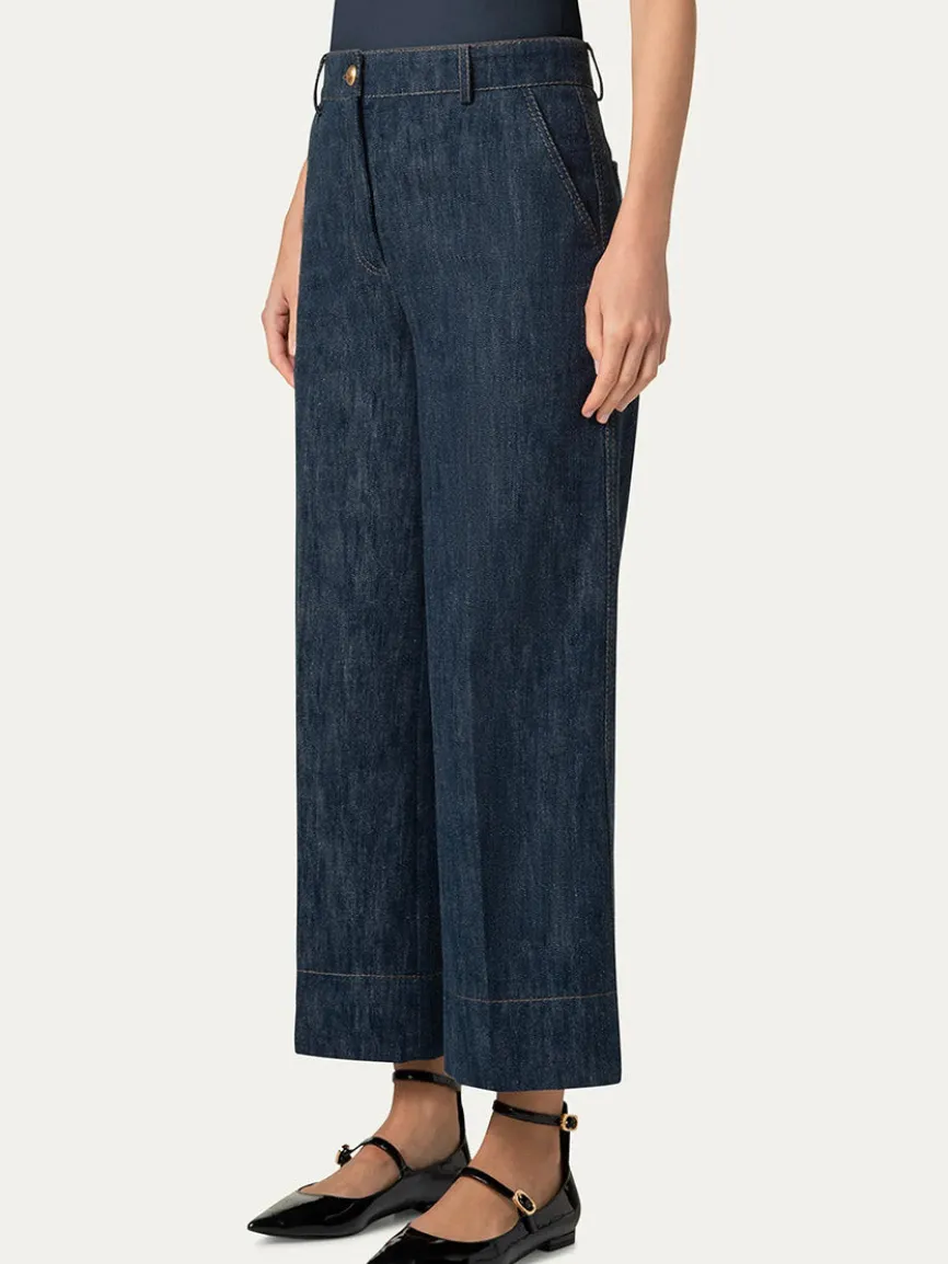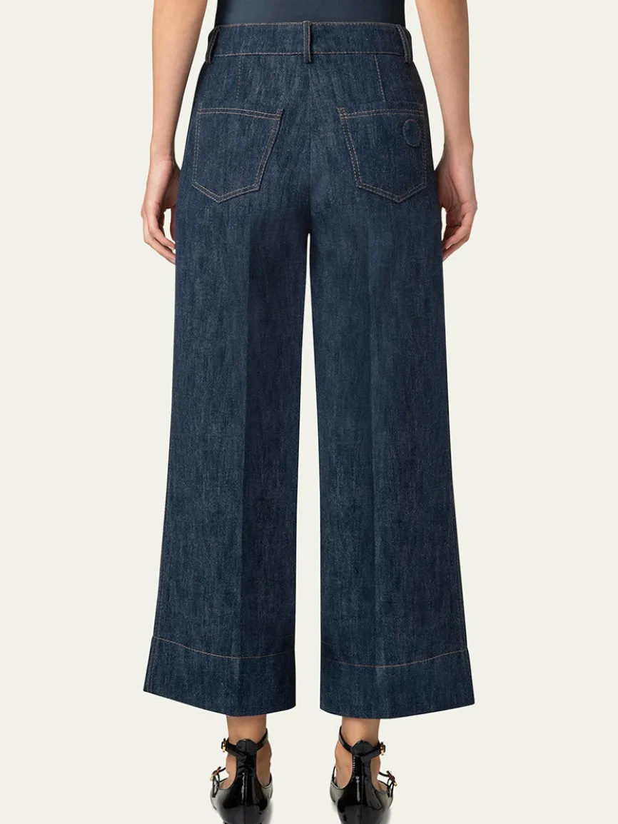 Akris Punto’s Chiara denim pants feature signature dot patch on back pocket. High rise. Flat front. Angled side slip pockets; back patch pockets. Wide legs. Cropped at the ankle.