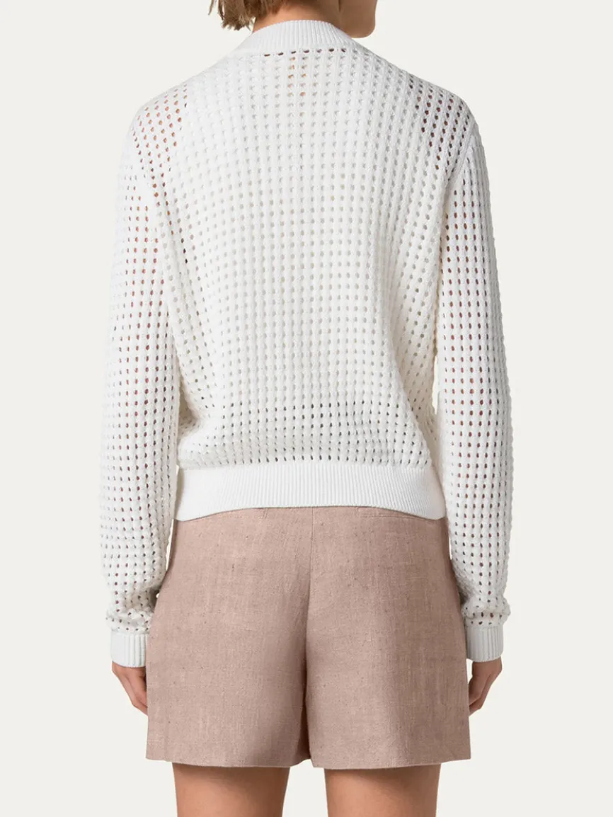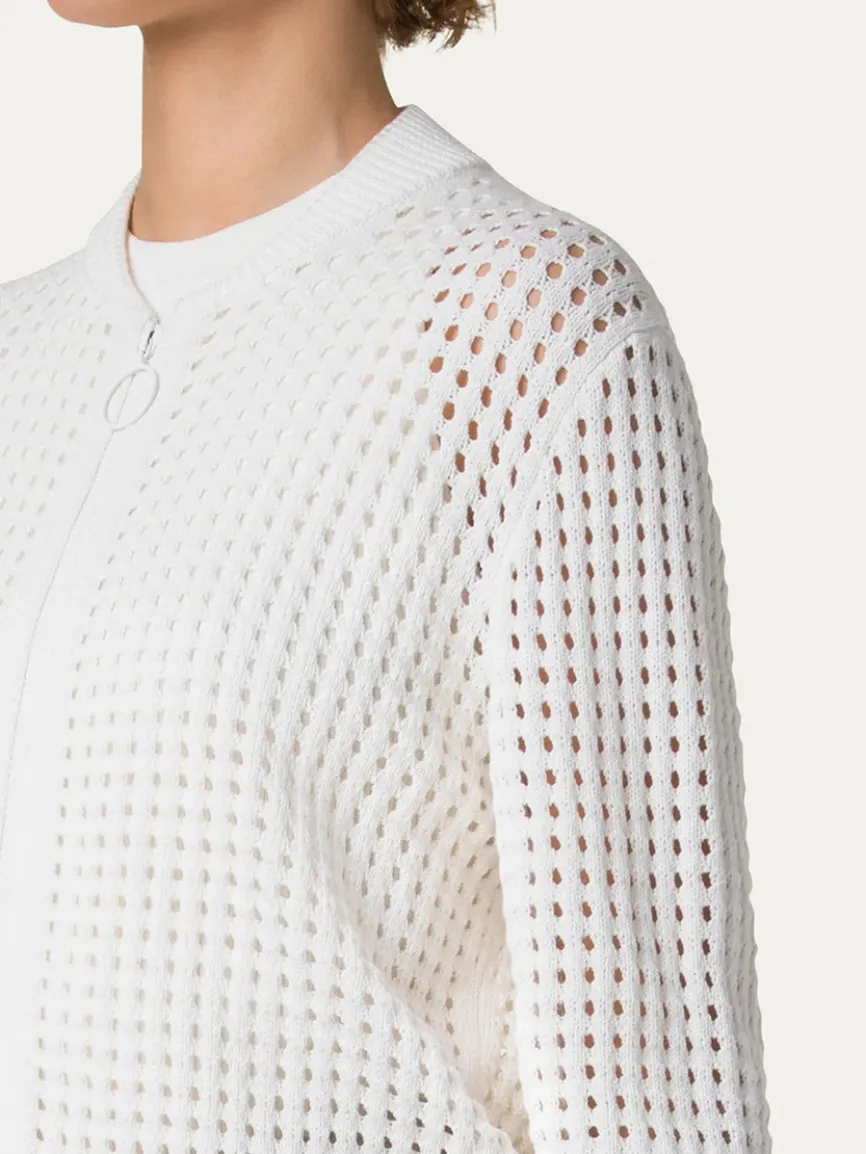 Akris Punto’s chunky mesh knit bomber-style cardigan. Stand-up collar; zip front. Long sleeves. Relaxed fit.