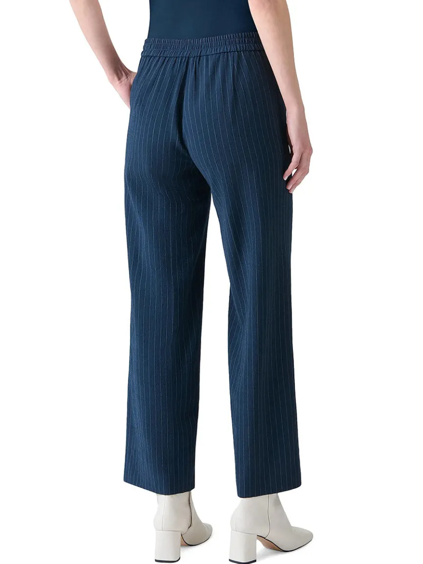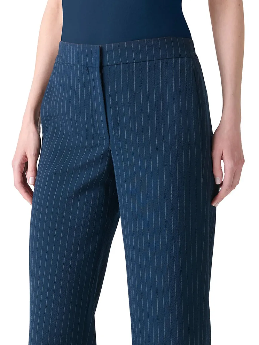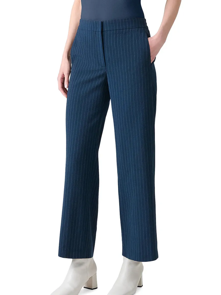 Akris Punto’s Marlon pinstripe pants are crafted of a virgin wool blend, a banded waist, and side seam pockets. Zip fly, hook-and-bar closure.
