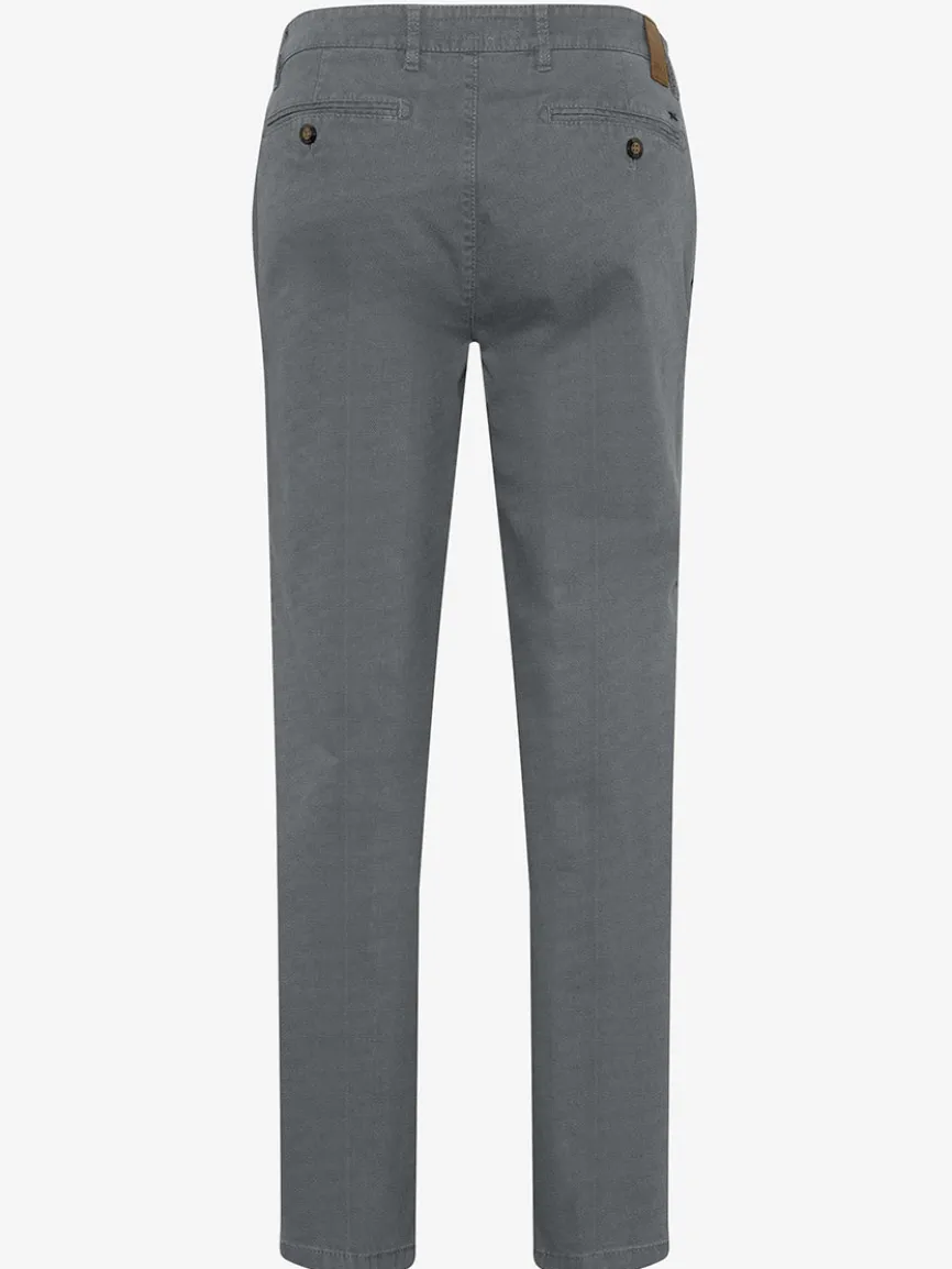 Everest flat front pant in solid Graphit. Cotton stretch, regular fit. Zip fly and button tab closure. Back pockets with button closure.
