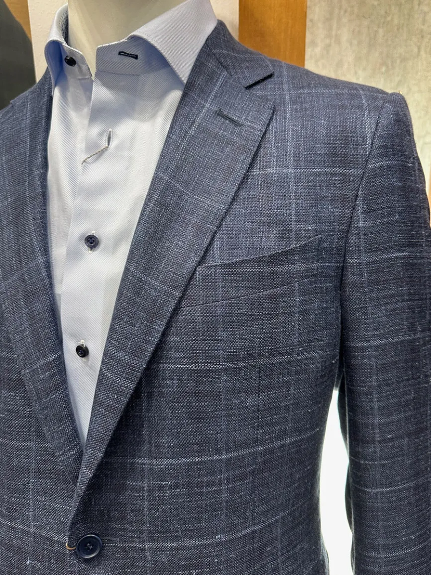 2-Button sport jacket in blue/white plaid. Notch lapels, side vents. Front flap pockets, besom chest pocket. Made in Italy.