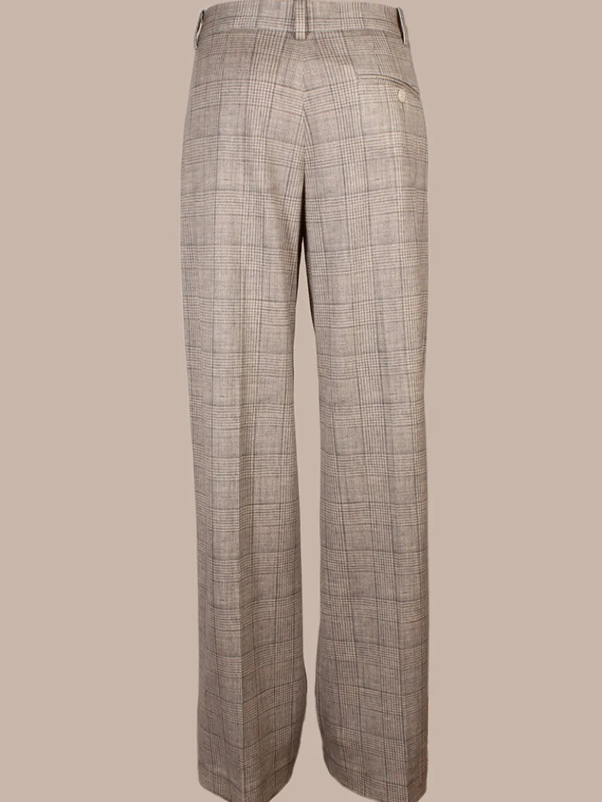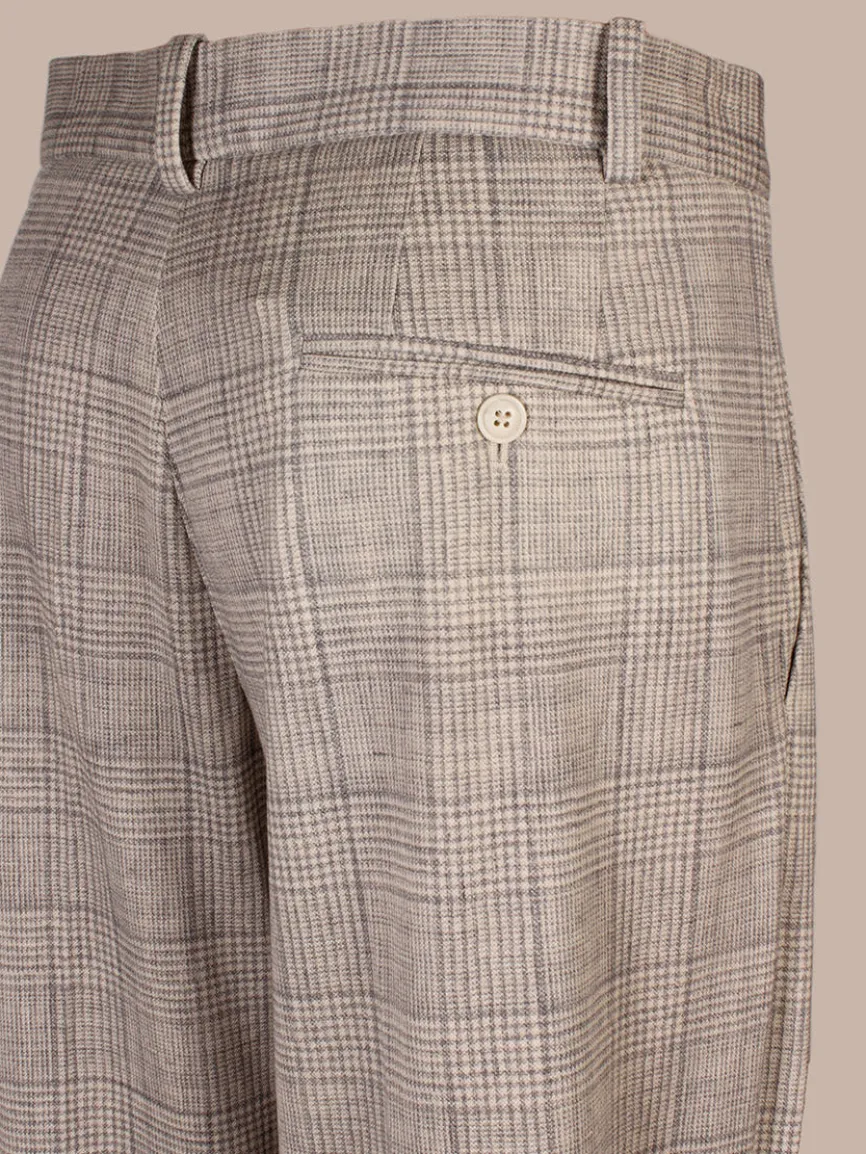 Prince of Wales Trouser in Grey Plaid. Back jetted pocket with button. On-seam pockets. Tab and bar closure with zip fly. Belt loops.