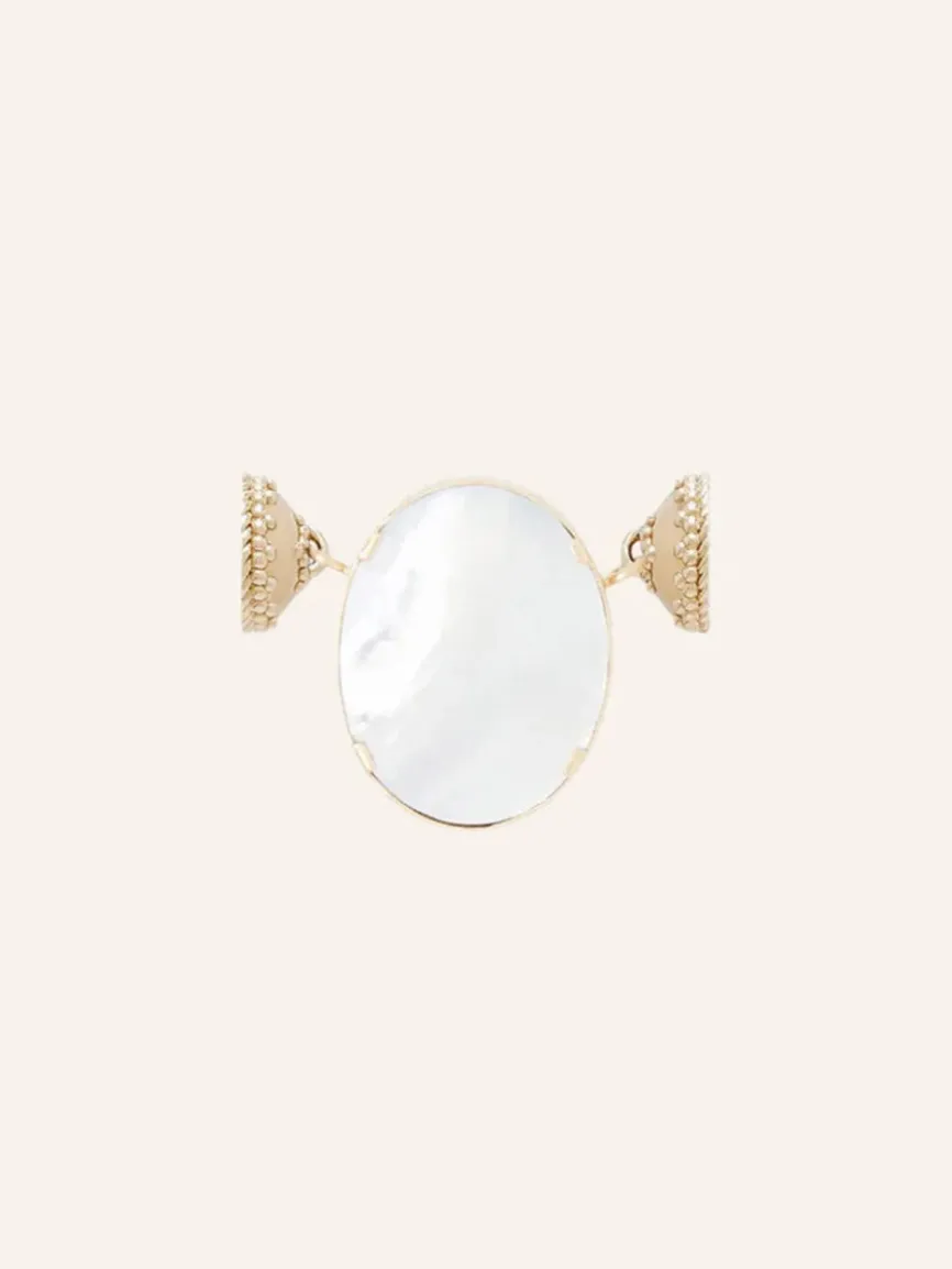 Limited Edition. Black Druzy. Reversible to white mother of pearl. Set in a solid 14K yellow gold bezel. Plated 14K yellow gold Mini ClaraClasp™. 1.25″ width by 1″ height.