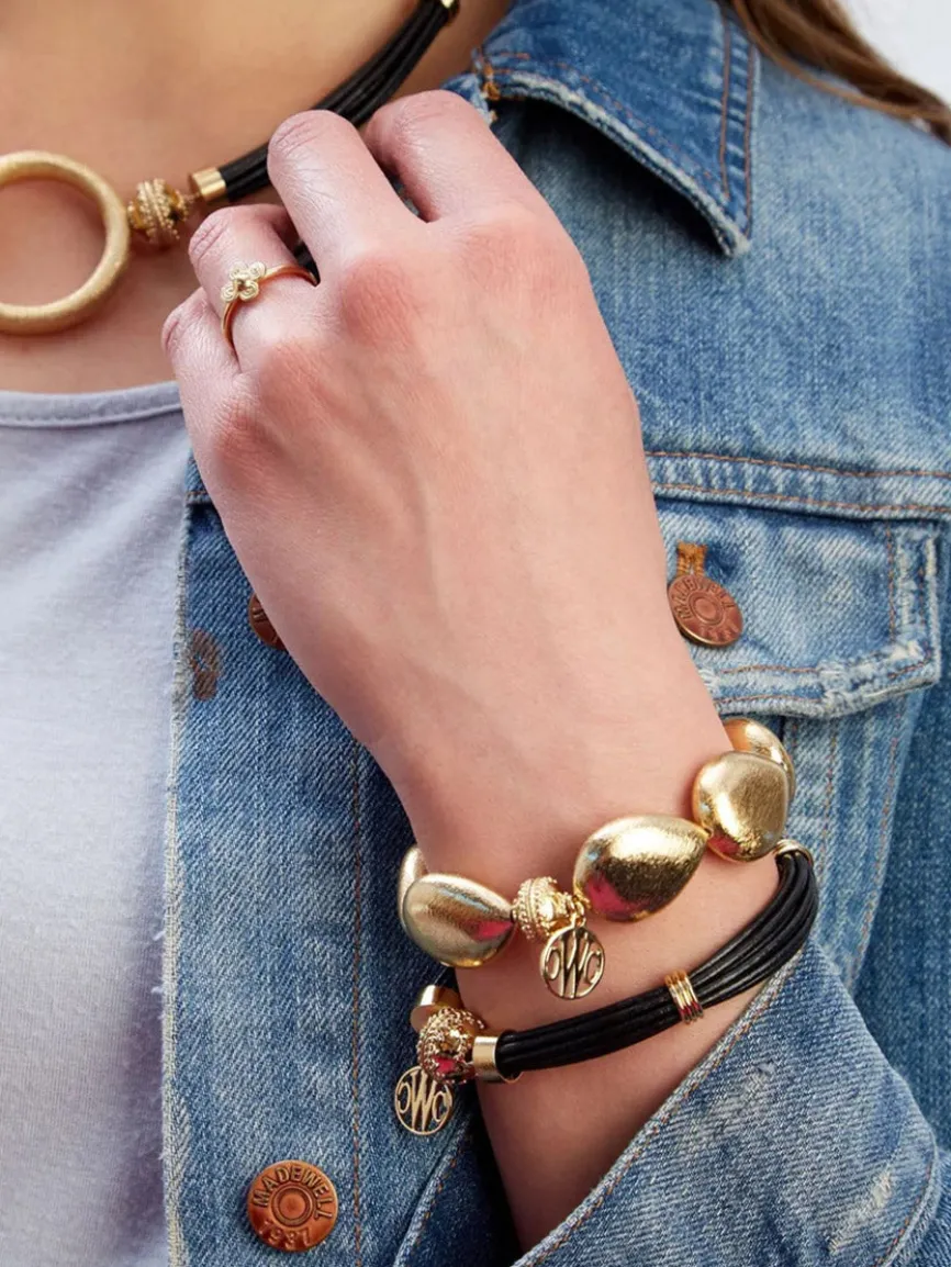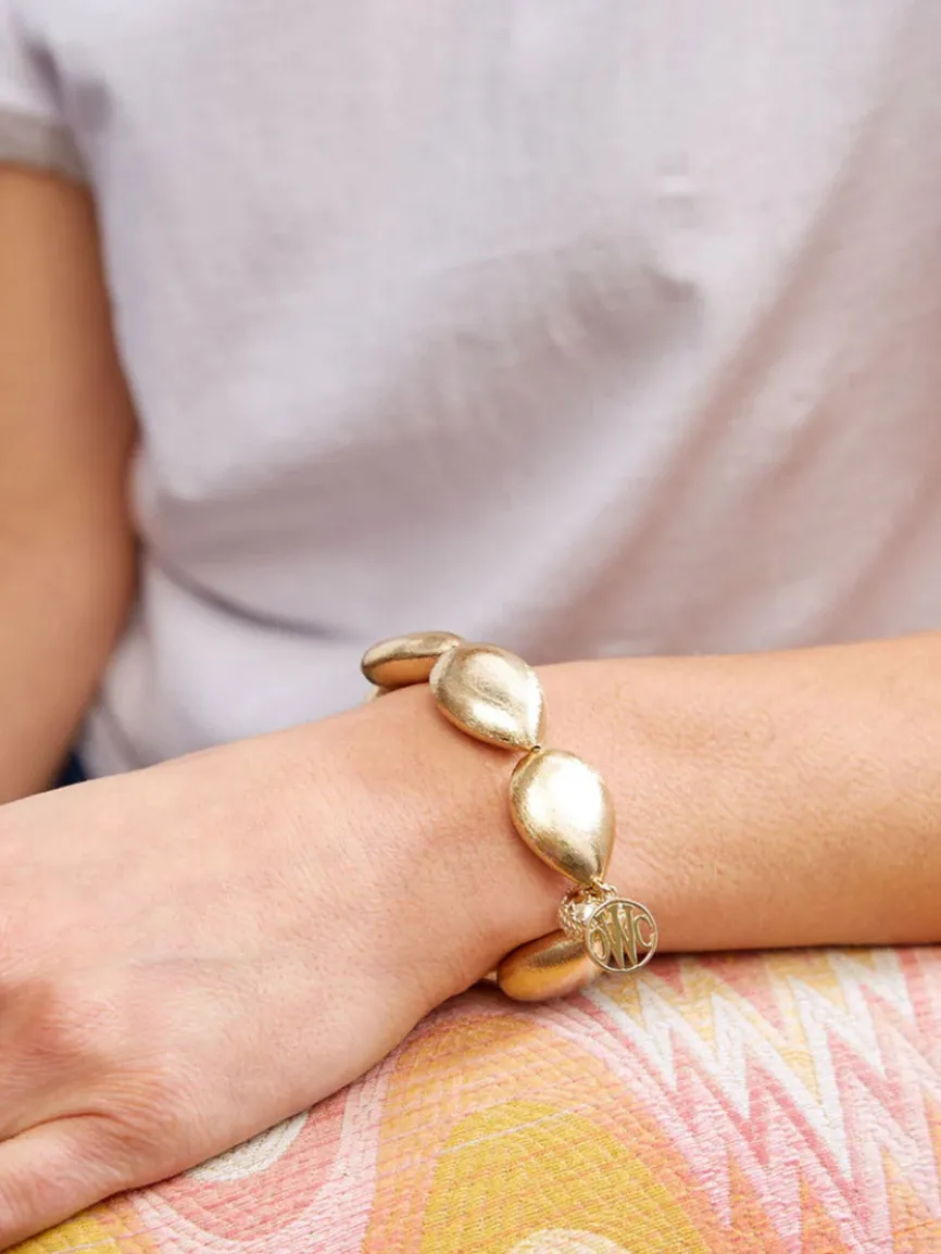 Sleek teardrop silhouette with a soft golden glow and high-polish finish. Hand-strung. Plated 14K yellow gold Signature ClaraClasp™ bead with Logo Charm. 7.5″ length.