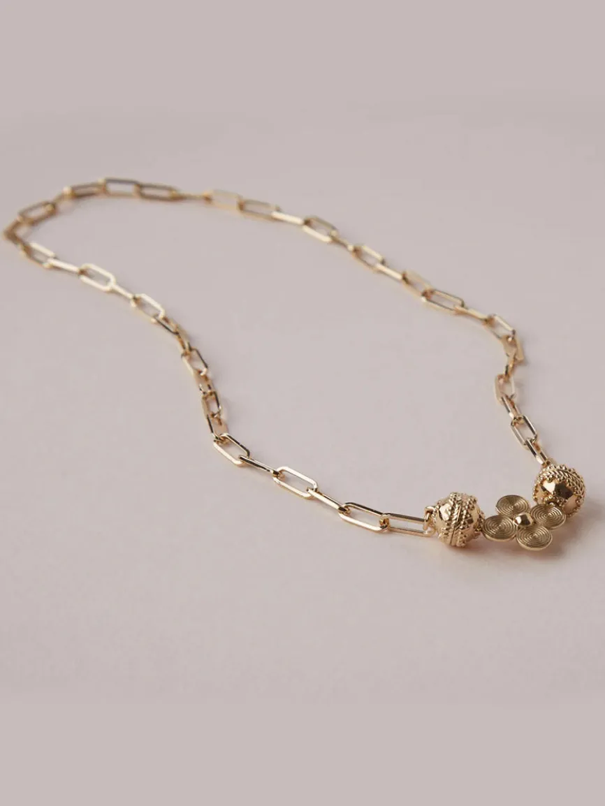 14K yellow gold plated delicate paperclip chain. Plated 14K yellow gold Mini ClaraClasp®. 16.5″ length.