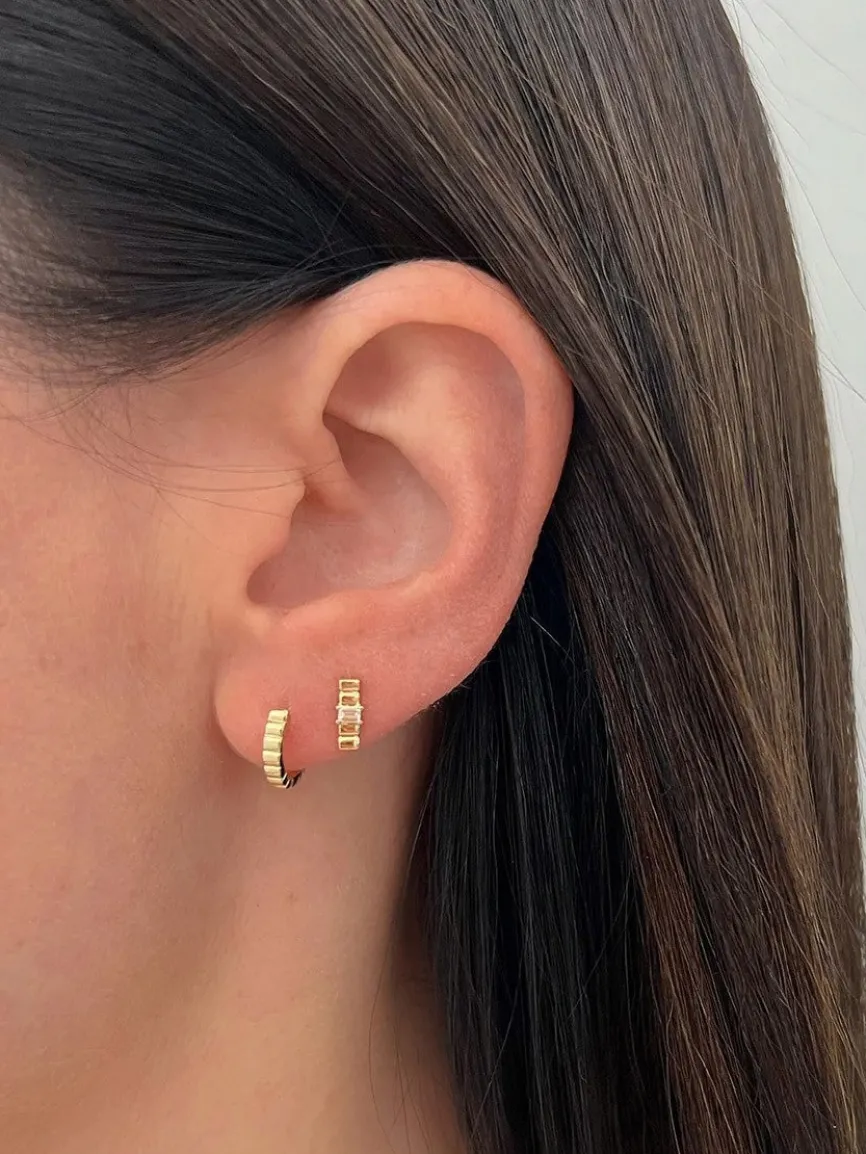 The Diamond & Gold Fluted Bar Stud Earring makes an impression. Featuring a 14k gold bar accented by a single baguette diamond, this stud will have your ears looking groovy in no time. Diamond weight: 0.06 carats for the pair. Earring height: 6.5 mm. Earring width: 2.5 mm. Diamonds are SI1-SI2 clarity with G-H color. Sold as a pair.
