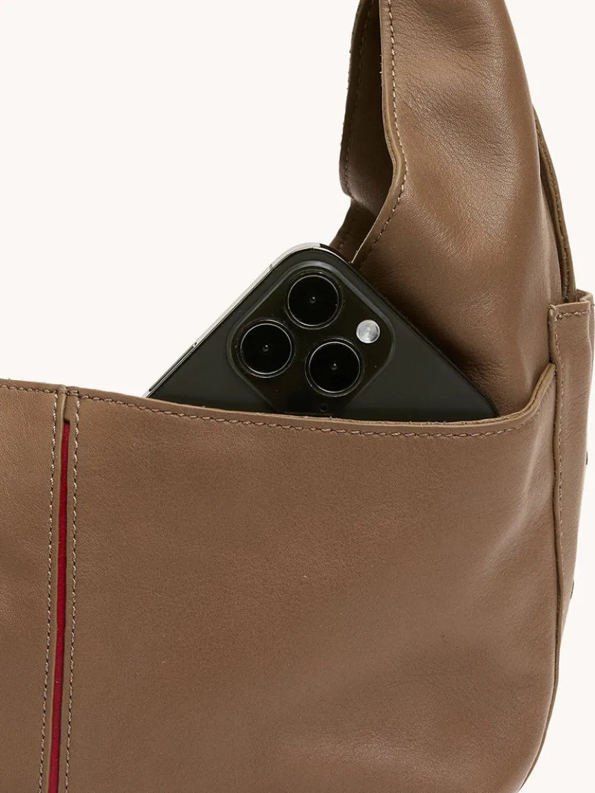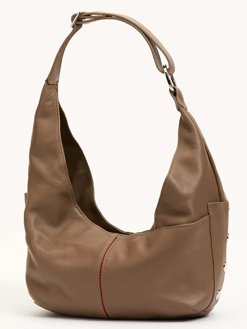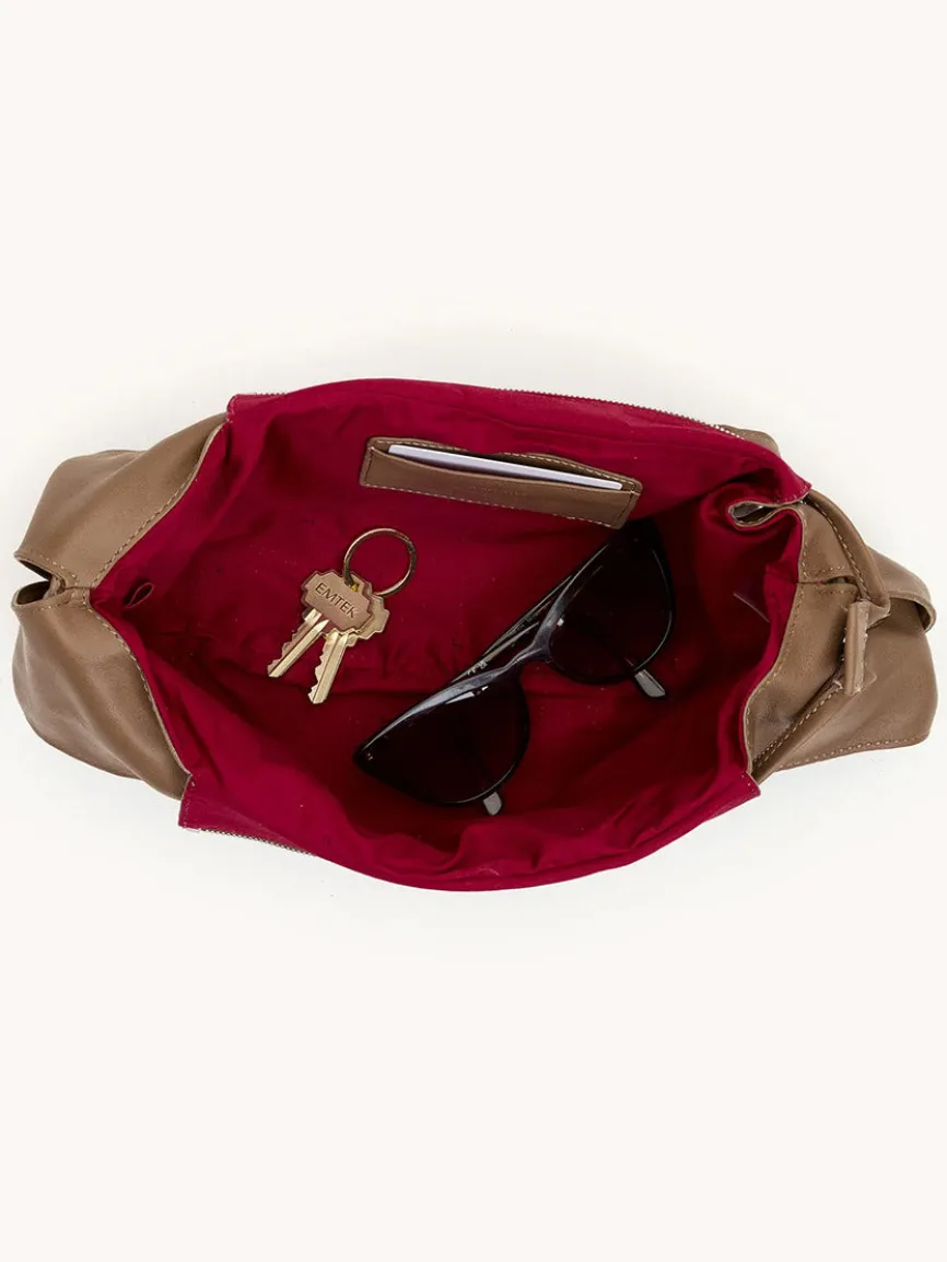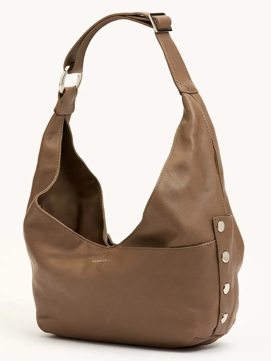 Meet the Tom Zip Med, a compact and trend-forward take on Hammitt’s best-loved hobo bag. Featuring an adjustable shoulder strap, zippered main compartment and exterior pockets, this fashion forward but spacious silhouette makes the ultimate day-to-night shoulder bag. Crafted with a smooth, midtone brown, semi-veg tanned leather with neutral undertones. Shiny silver hardware. Features a zippered main compartment and adjustable strap. Exterior: side panels, crisscross drop pockets on front and back panels, adjustable shoulder strap with large O ring, slit detail sides of bag, zippered main compartment. Interior: credit card slot, interior drop pockets created from crisscross construction. Red Cotton Twill Lining. Bag: 10.5 (base)L x 4.25″ W x 9.5″ H. Handle: 1″W x 5.75″ L (8.5″ L drop/folded).