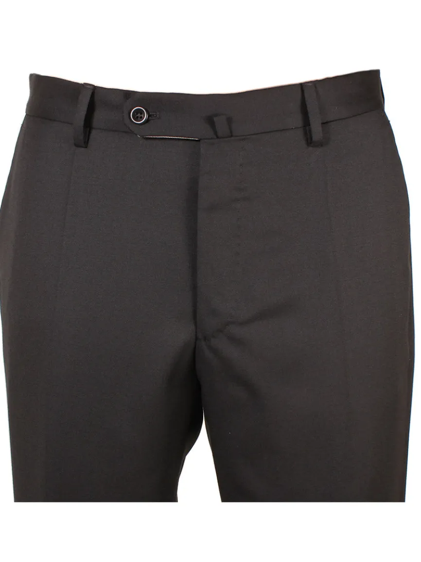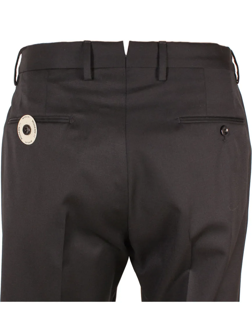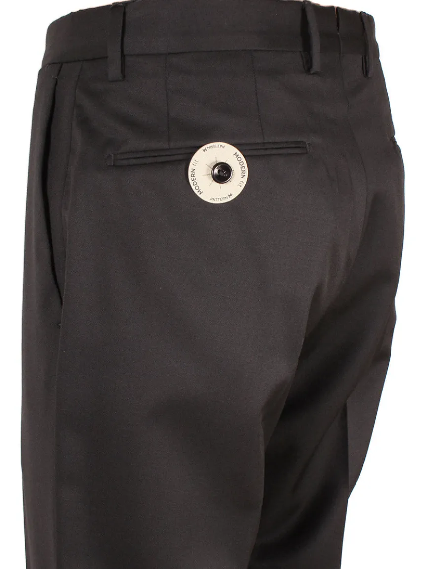 FINAL SALE: Super 100s Batavia wool ‘Matty’ 4-season trousers in Black. Zip fly with tab-button closure. Front slash pockets, back button welt pockets. Belt loops. Unfinished hem.