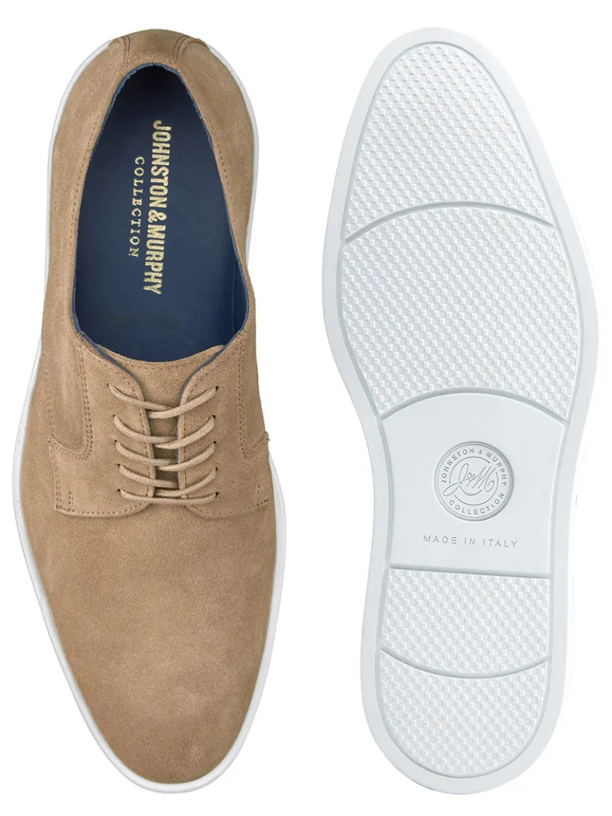 Crafted for Johnston & Murphy Collection. Italian suede uppers. Full leather lining. Molded, removable polyurethane footbed with enhanced cushioning. Rubber outsole.