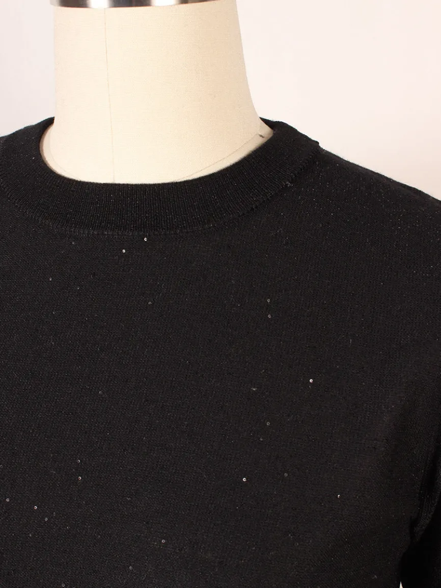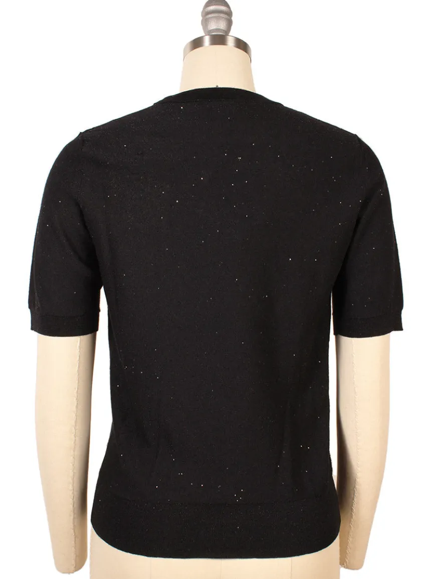 Short sleeve crew with tiny sequins throughout. Ribbed trim. Center back length on a Small is 22″.