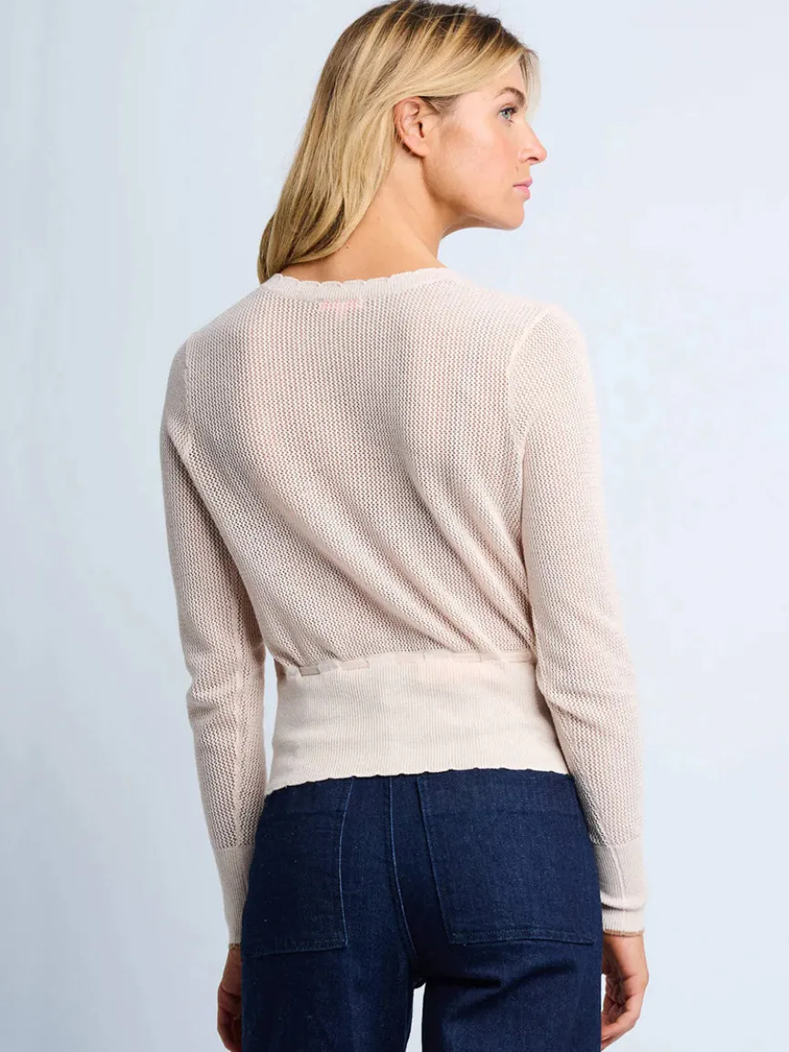 Feminine and refined, The Flirt cardigan features scalloped edging, floral intarsia, and an open-stitch texture. A slim fit silhouette, seven-button closure, and self-tie at the waist lend subtle definition. Crafted in a soft Cotton-Cashmere blend. Contrast tipping at cuffs.