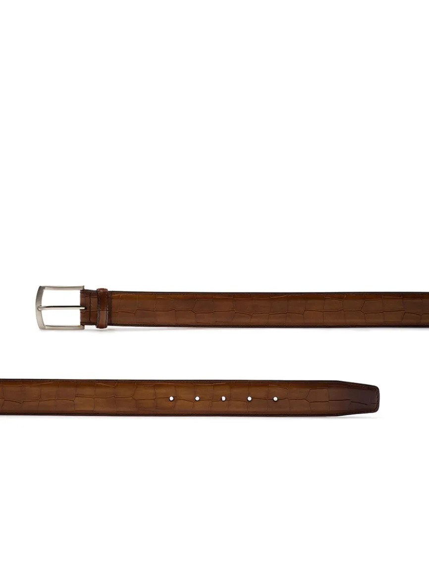 The Grabar belt is crafted from Magnanni’s alligator embossed calfskin leather. A gentle curved belt buckle pairs with the antiqued details of the leather to create a staple for any wardrobe. Made in Spain.