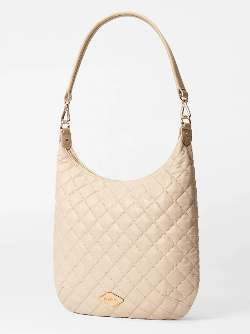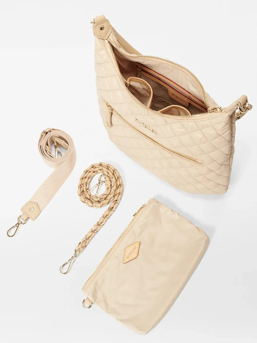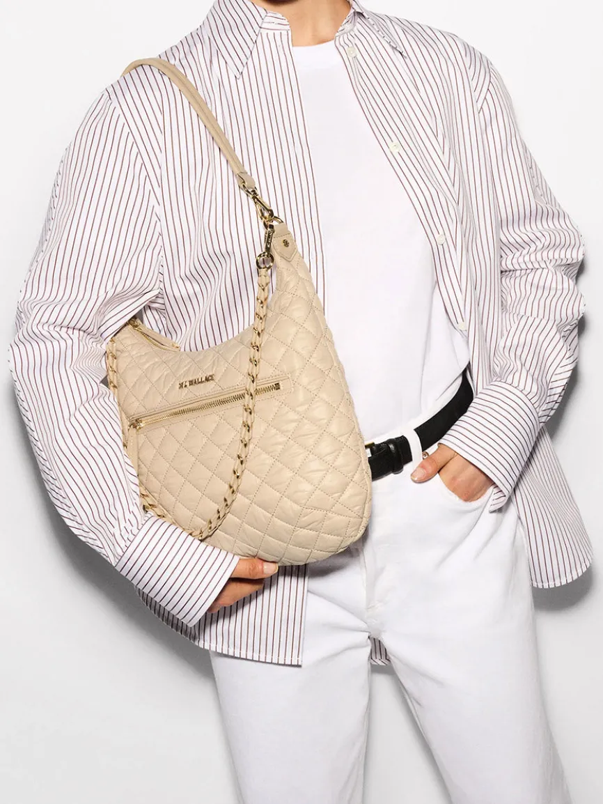 REC Oxford bluesign® APPROVED fabrication. Italian leather trim. Light gold hardware. Zip top closure. Italian leather handle. Detachable chain strap. One exterior pocket. Beige leather edging. 6 interior pockets. Beige interior lining. One detachable pouch. Phone pocket. Key ring strap. Dimensions: 12.6 L × 10.6 H. Adjustable strap length: 27.6″ – 50.4″.