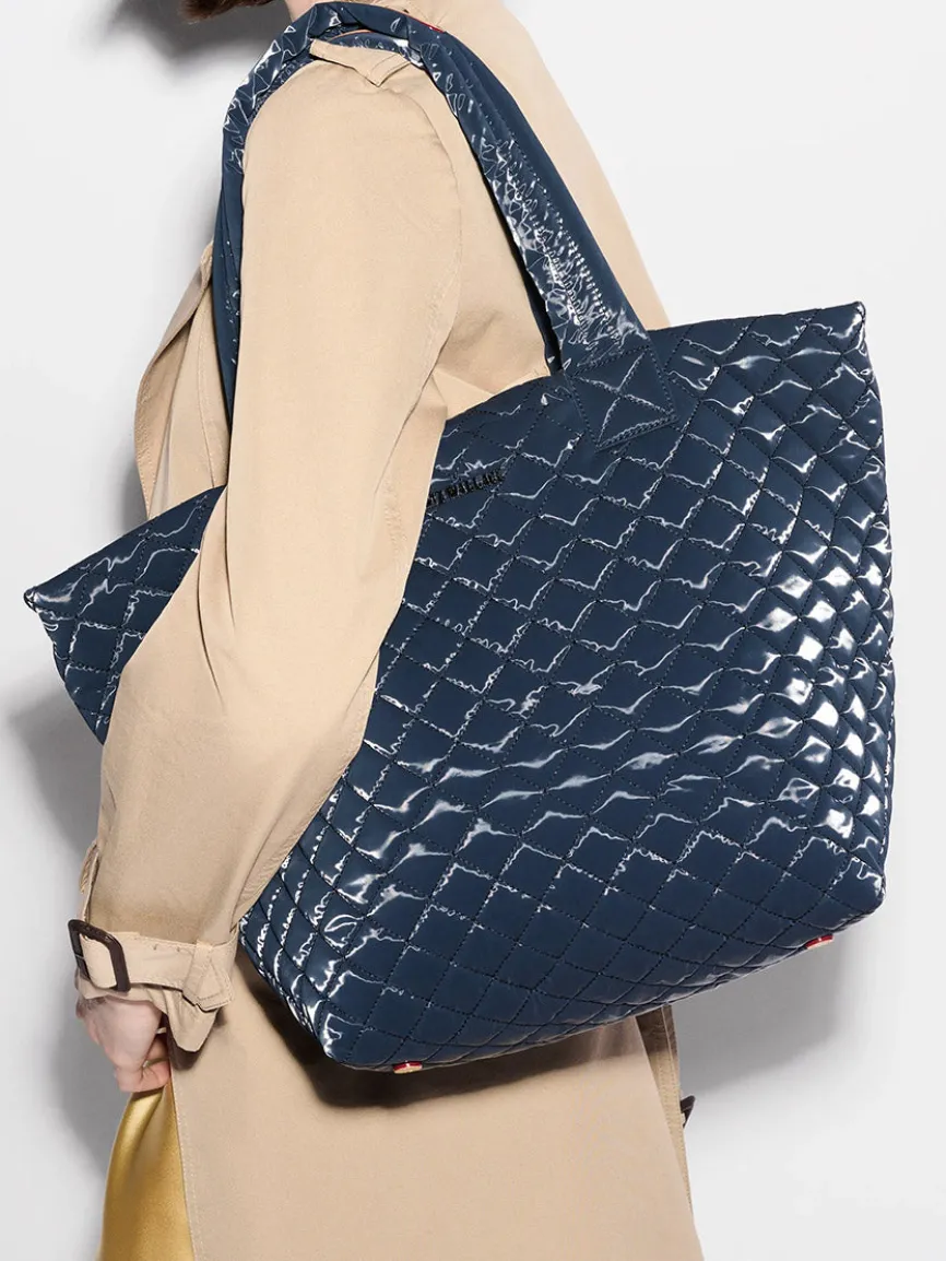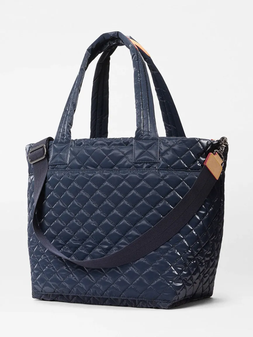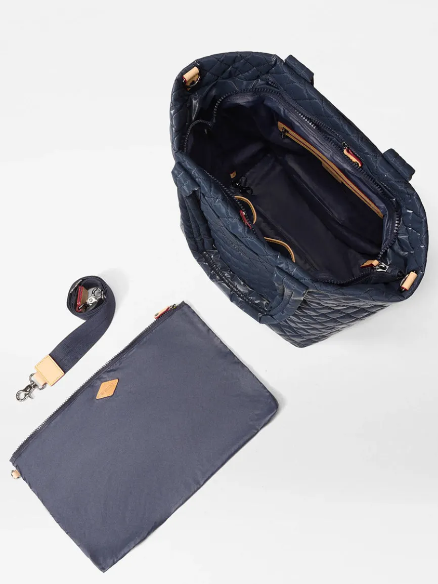 Designed to do (even) more, the Medium Metro Tote Deluxe adds new, innovative features to MZ’s best-selling Metro Tote silhouette. With a luggage sleeve, two exterior slip pockets, two zippered collar pockets and a removable, adjustable crossbody strap, it’s ready for the office, the gym, the airport — and wherever else your day takes you. Zip top closure. Gunmetal hardware. Natural Italian leather trim and protective feet. Signature red leather edging. Blue interior lining. 5 exterior pockets. Luggage sleeve. Fits a 13″ laptop. 6 interior pockets. 1 detachable pouch. Phone pocket. Key ring strap. Dimensions: 11.6″L × 9.4″W × 12.7″H. Adjustable strap length: 26.4″ – 45.3″.