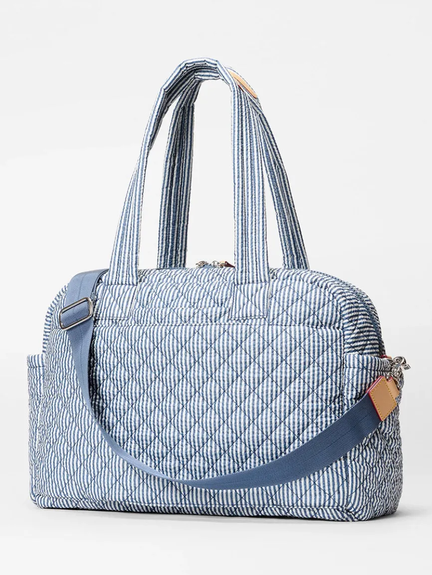 Discover the MZ Wallace Nik seersucker duffel bag designed for busy, travel days. Keep things simple and stylish with this sleek medium duffel bag. Oxford bluesign® APPROVED fabric. Zip top closure. Natural Italian leather trim & protective feet. Silver hardware. Blue interior lining. 9 interior pockets. 1 detachable pouch. 7 exterior pockets. Luggage sleeve. Detachable, adjustable nylon crossbody strap. Fits a laptop up to: 16.0 in. Dimensions: 16.9 L × 7.1 W × 12.2 H in. Handle Drop: 11.0 in. Adjustable strap length: 28.3 in – 50.4 in.