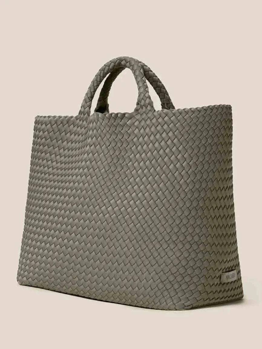 - Fabric: Handwoven neoprene (polyester) with pebbled vegan leather trim.