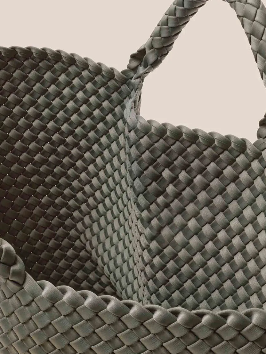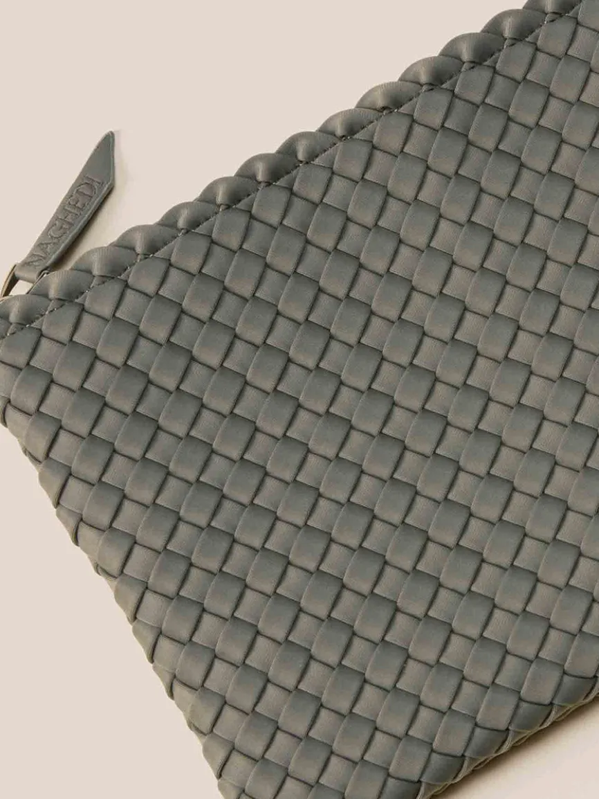 Handwoven neoprene in gray-green. The Nomad Medium Hobo is spacious and comfortable for all-day wear, with a wide strap that sits flat on the shoulder. Open top with magnetic snap closure. Shoulder strap. Strap is intentionally designed slightly shorter; it will gently stretch to the perfect length with wear. Matching woven zippered pouch included. Height: 20″ Width: 15″ Depth: 5″.
