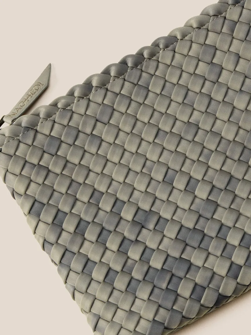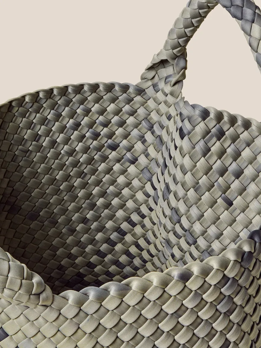 Handwoven neoprene in gray and navy. Naghedi’s original design, the St. Barths Medium Tote is a versatile, everyday bag for work, beach, or travel. Watercolor is delicately hand shaded to create a fluid, layered effect. Open top. Matching woven zippered pouch included. Handles fit over the shoulder and are intentionally designed slightly shorter; they will gently stretch to the perfect length with wear. Due to the handcrafted nature of Naghedi’s bags, slight variations in color are normal and to be expected. Depth: 7″ Width: 17″ Height: 9.5″.